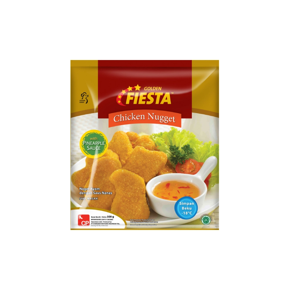 GOLDEN FIESTA Nugget With Pineapple Sauce terbuat dari daging ayam bagian dada ayam yang dilengkapi dengan saus nanas. Tersedia dalam ukuran 500gr.