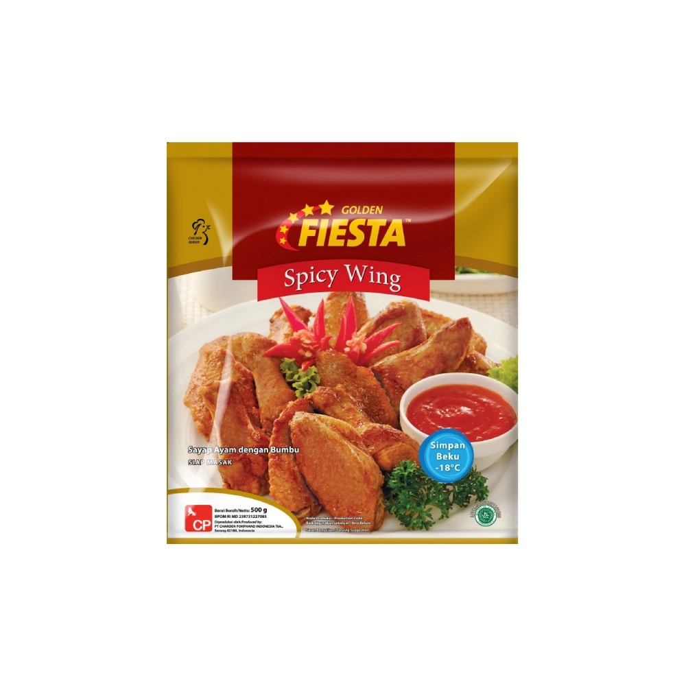 GOLDEN FIESTA Spicy Wing terbuat dari sayap ayam yang dibumbui dan dipanggang. Tersedia dalam ukuran 500gr.